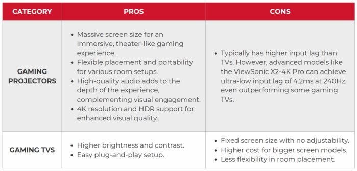 Выбор между игровым проектором и игровым телевизором зависит от ваших приоритетов, будь то захватывающий размер экрана, низкая задержка ввода или универсальность в настройке. Ниже приведен анализ плюсов и минусов каждого из них, чтобы помочь вам решить, какой из них лучше всего подходит для ваших игровых потребностей.