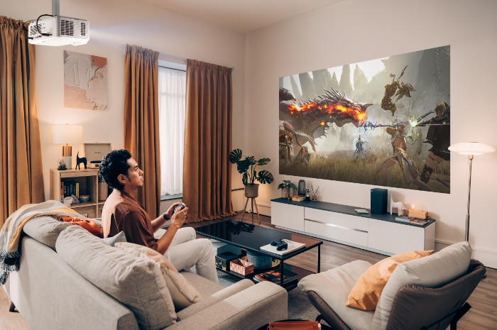 Игровые проекторы: Проекторы для игр могут проецировать экраны размером 100 дюймов и более, обеспечивая кинематографический игровой опыт за малую часть стоимости. В отличие от телевизоров, проекторы не имеют экрана, сохраняя минималистичную эстетику, когда они не используются, и позволяя сделать жилое пространство более универсальным. Некоторые модели также являются портативными, что позволяет гибко просматривать в разных местах, а не фиксироваться в одном месте, как телевизор.