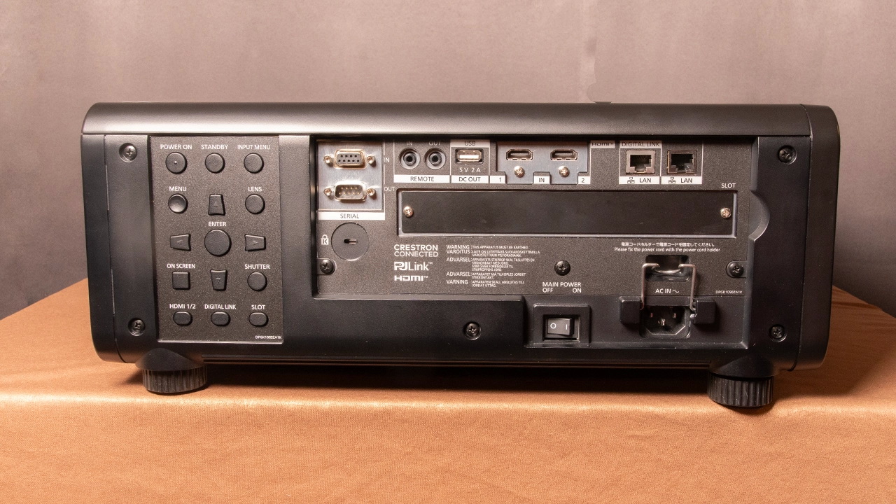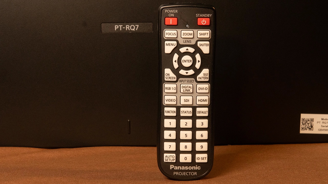 Объектив проектора расположен по центру передней панели. PT-RQ7 оснащён функцией электронного сдвига объектива, доступной с пульта дистанционного управления или панели управления проектора, что позволяет регулировать как горизонтальный, так и вертикальный сдвиг объектива. Величина горизонтального и вертикального сдвига объектива зависит от выбранного объектива. Ниже представлена таблица со всеми дополнительными объективами, доступными для этого проектора. Для тестирования использовался объектив ET-DLE170 с соотношением сторон 1,71–2,40:1 (4K, 16:9). Этот объектив обеспечивает электроприводный сдвиг объектива по горизонтали и вертикали.