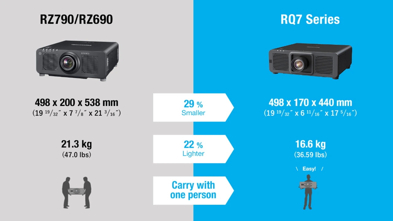 Panasonic PT-RQ7L доступен в белом и чёрном корпусах размером 498 x 170 x 440 мм и весом 16,59 кг. Имейте в виду, что вес проектора зависит от установленного дополнительного объектива.