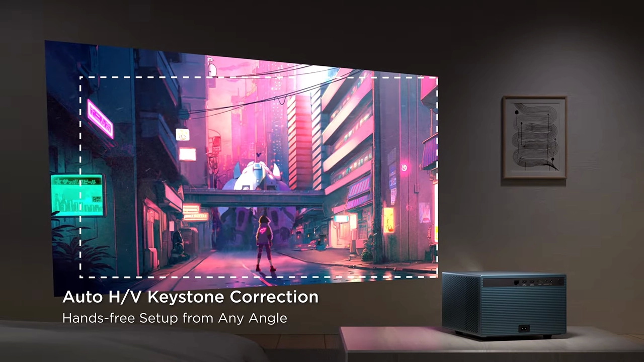 Проектор также оснащен автоматической коррекцией трапецеидальных искажений, которая точно устраняет как горизонтальные, так и вертикальные искажения. В дополнение к регулировке по 4 углам, эта функция гарантирует, что даже при установке проектора под углом изображение будет иметь идеальную прямоугольную форму, устраняя геометрические искажения и позволяя гибко размещать проектор в любом помещении.