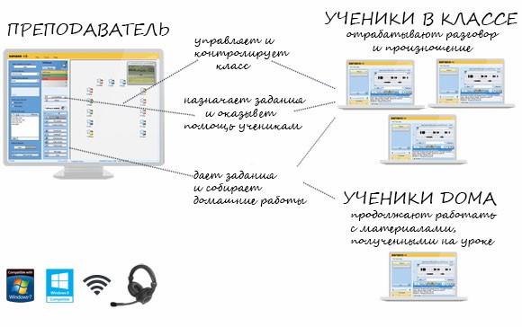 Ученики слушают и повторяют аудио образец, переданный учителем, для отработки ударения, ритма и интонации иностранного языка. Записанные образцовые аудио дорожки и аудио дорожки, записанные студентами, позволяют легко определить и скорректировать области, которые нужно улучшить.