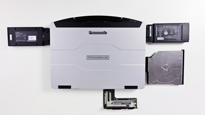 В нижней части Panasonic Toughbook FZ-55 Mk3 показано, как модульные пакеты xPak вписываются в ноутбук