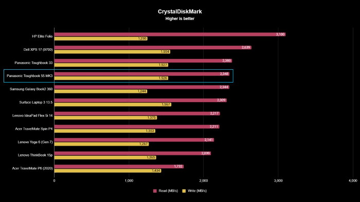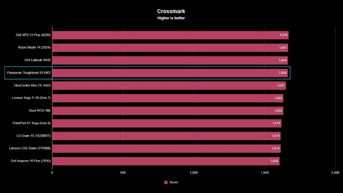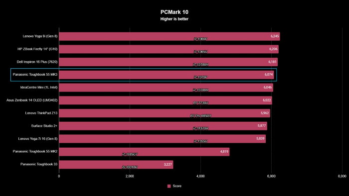 Благодаря процессорам Intel 13-го поколения и графике Iris Xe Toughbook FZ-55 хорошо показал себя в тестах, опередив мощную рабочую станцию HP ZBook Firefly 14 (G10).