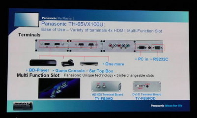 В новой панели не используется встроенный ТВ-тюнер и пользователь сам решает, что и как ему подключить к плазме, то есть фактически это на самом деле монитор. Плазменная панель Panasonic TH-65VX100U имеет 4 HDMI-входа и компьютерный VGA-вход, также присутствует разъем RS-232 и специальный мультифункциональный слот, куда могут быть интегрированы различные устройства.. Пользовательское меню богато различными настройками, имеет 6 встроенных пресетов настройки гамма-кривой и позволяет отдельно для каждого входа сохранить установленные уровни.