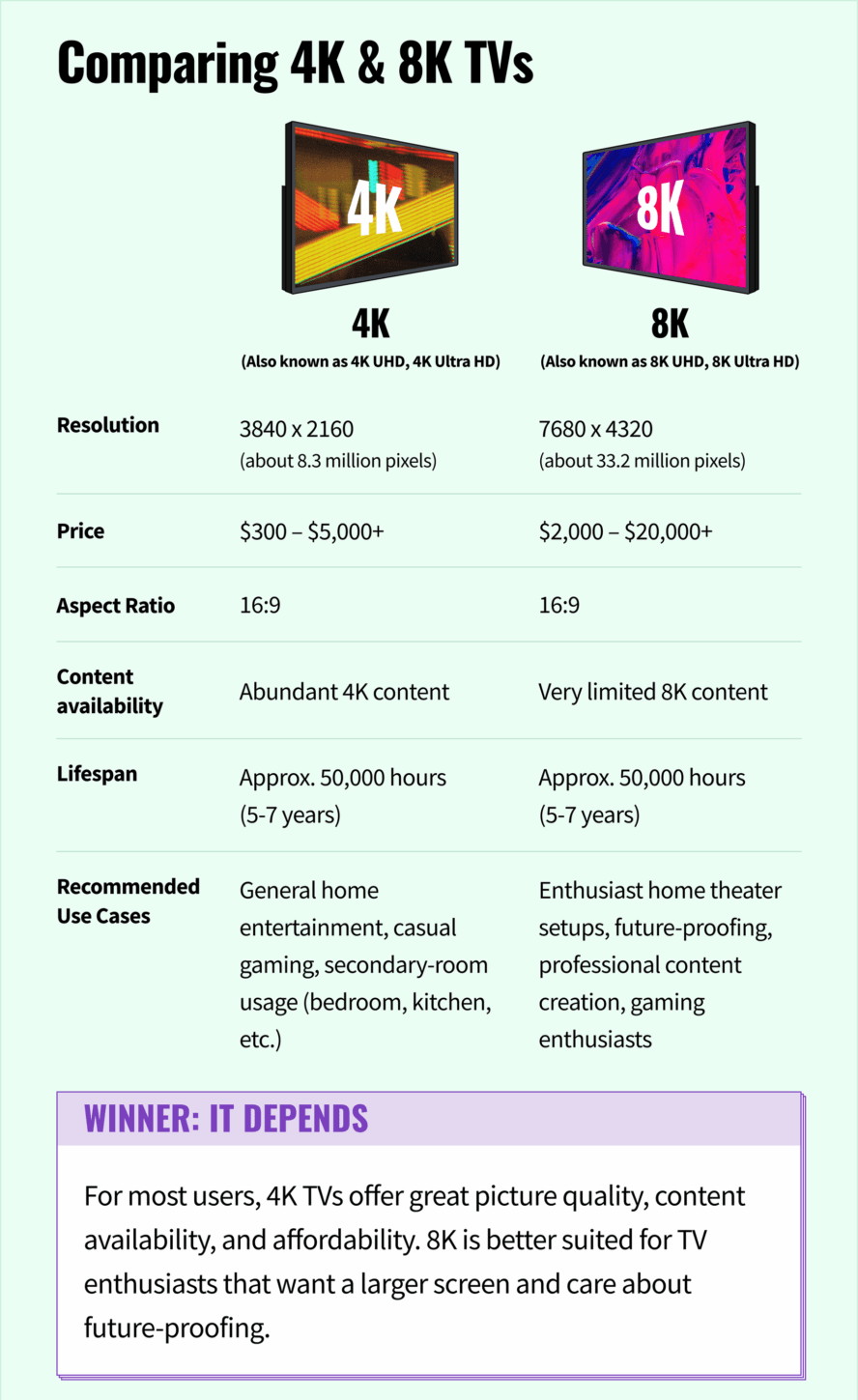 В настоящее время 4K — это наиболее распространенное разрешение для телевизоров. Поэтому доступно огромное количество контента, включая телепередачи, фильмы, потоковое вещание и игры. Так же, как 4K обогнало 1080p, 8K в конечном итоге превзойдет 4K, как только стоимость производства телевизоров снизится настолько, что их сможет позволить себе приобрести среднестатистический потребитель.