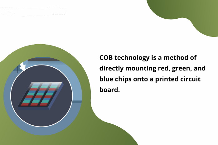 Технология «чип на плате» (COB) — это метод прямого монтажа красных, зеленых и синих микросхем на печатную плату (PCB). Упаковка голых чипов непосредственно на печатную плату обеспечивает гораздо более высокую плотность чипов при создании плоской однородной поверхности светодиодов. Комбинация трехцветных значений позволяет чипам достигать более широкой цветовой гаммы и воспроизводить реалистичные изображения.