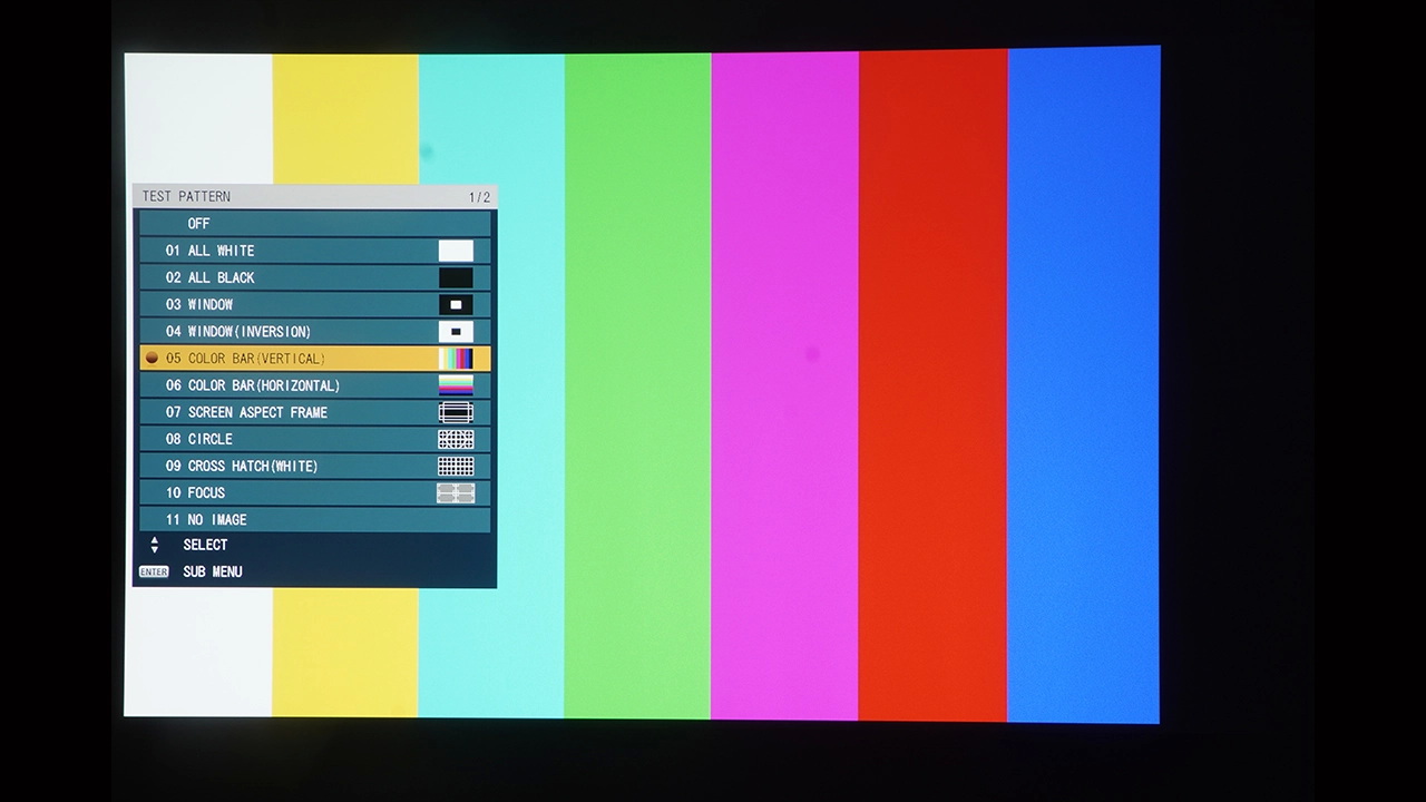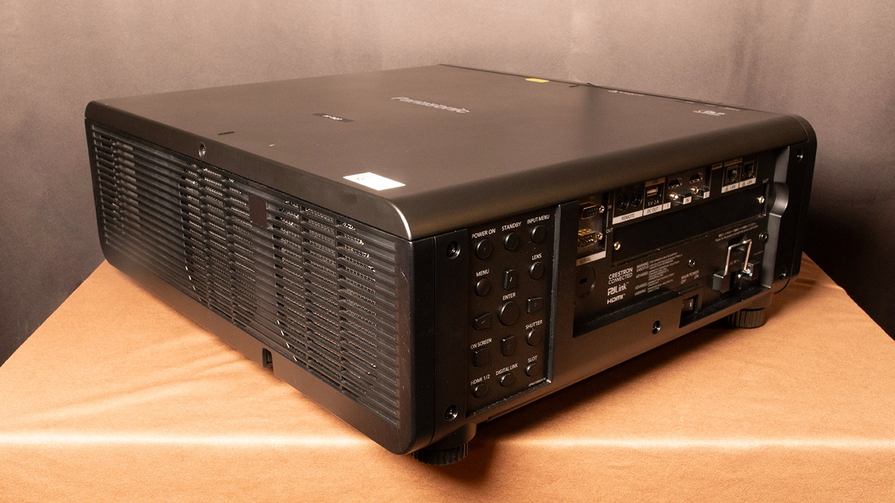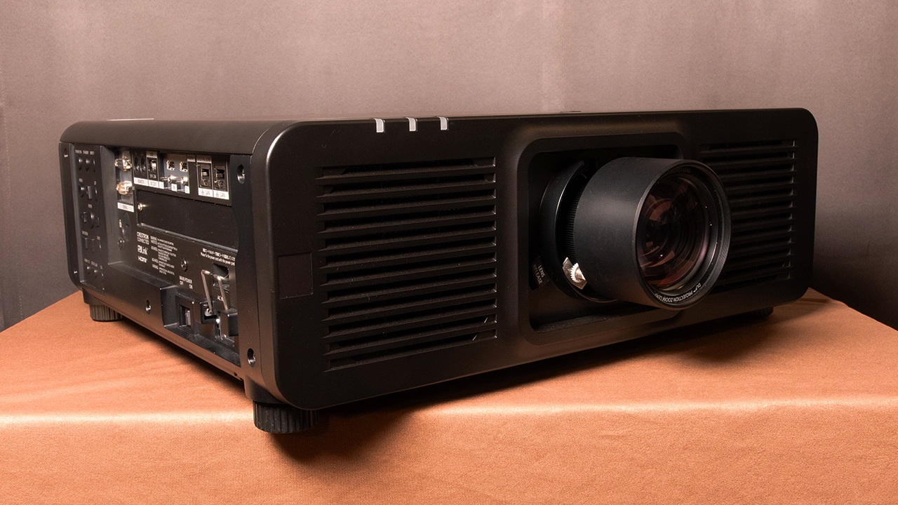 Объектив проектора расположен по центру передней панели. PT-RQ7 оснащён функцией электронного сдвига объектива, доступной с пульта дистанционного управления или панели управления проектора, что позволяет регулировать как горизонтальный, так и вертикальный сдвиг объектива. Величина горизонтального и вертикального сдвига объектива зависит от выбранного объектива. Ниже представлена таблица со всеми дополнительными объективами, доступными для этого проектора. Для тестирования использовался объектив ET-DLE170 с соотношением сторон 1,71–2,40:1 (4K, 16:9). Этот объектив обеспечивает электроприводный сдвиг объектива по горизонтали и вертикали.