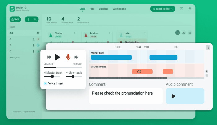 Программное обеспечение для обучения языку Sanako Connect сочетает в себе функции оценивания и обучения. Это помогает преподавателям создавать и отмечать устные оценки, тем самым экономя значительное количество времени и энергии. Например, преподаватели могут быстро заполнять и отмечать предварительно подготовленные викторины с несколькими вариантами ответов или тесты с одним ответом в Sanako Connect. Все записи учащихся также будут доступны на вкладке «Отправленные материалы» Sanako Connect для просмотра учителями.