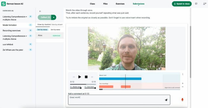 Напротив, Connect был специально разработан, чтобы учителям было как можно проще оценивать работу и давать обратную связь ученикам. Преподаватели могут давать обратную связь непосредственно отдельным учащимся или одновременно всему классу с помощью текстового сообщения или общего аудиофайла. Преподаватели также могут записывать устные отзывы и даже нацеливать свои комментарии на определенные моменты записанного устного выступления учащегося!