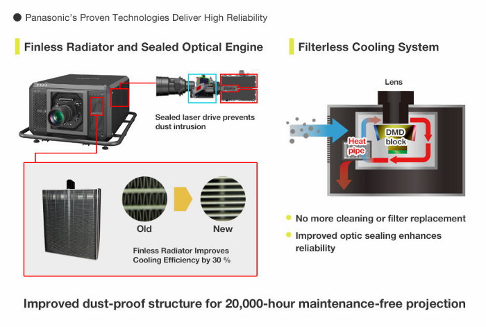 Оптические блоки DMD, используемые в лазерных проекторах Panasonic DLP, запечатаны. Это делает эти модели отличным решением для надежной работы в течение 20 000 часов.