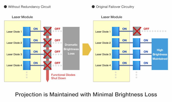 Это означает, что лазерные диоды сгруппированы в несколько лазерных модулей. Если один диод в модуле выходит из строя, обходятся только лазерные диоды в соответствующей серии. Остальные диоды продолжают работать, поэтому яркость проектора близка к полной. В случае многих других лазерных проекторов при отказе лазерного диода отключается весь модуль, что приводит к резкому снижению яркости. Multi-Drive Laser Optical Engine добавляет неоценимый уровень страховки и спокойствия, когда представление изображения не должно прерываться.